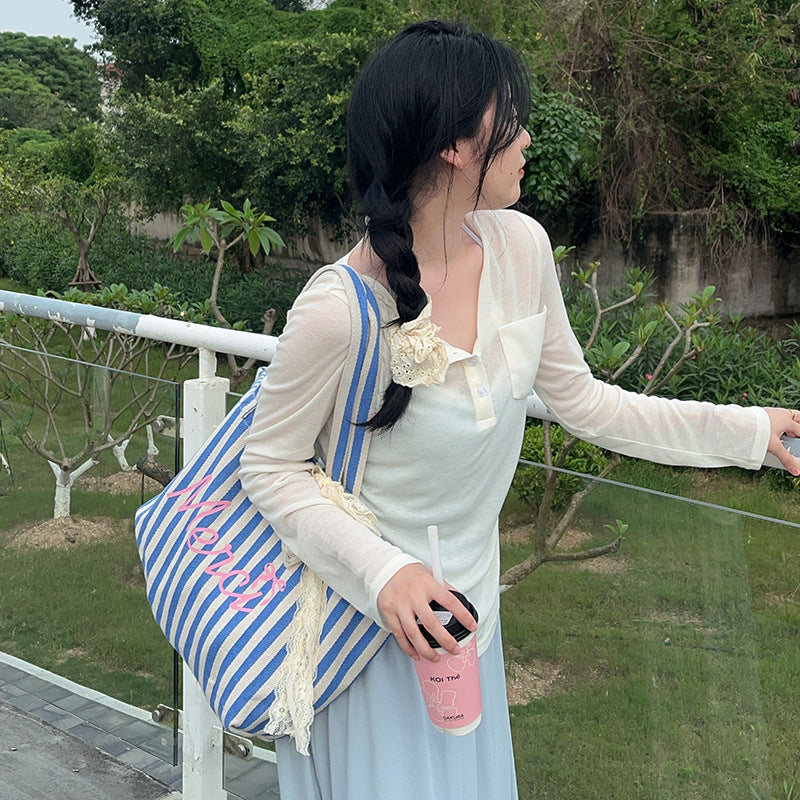 Blue Striped Letters Printed All-matching Canvas Bag